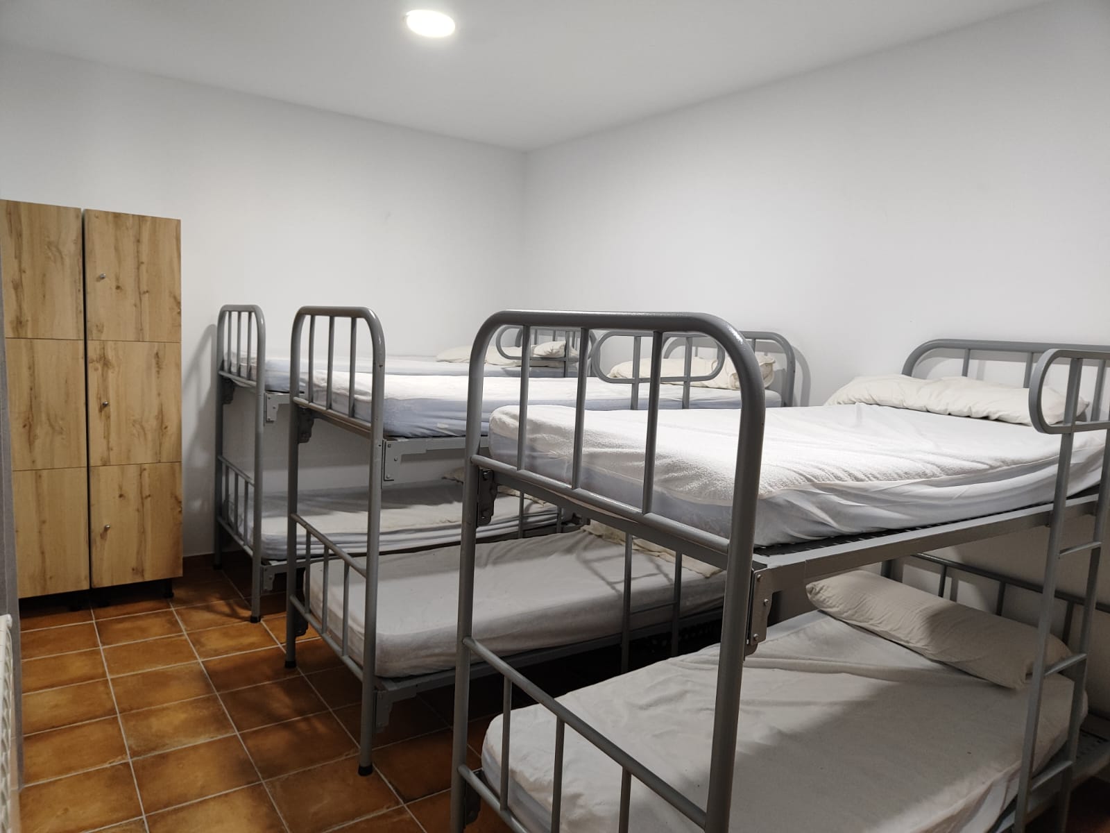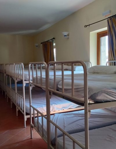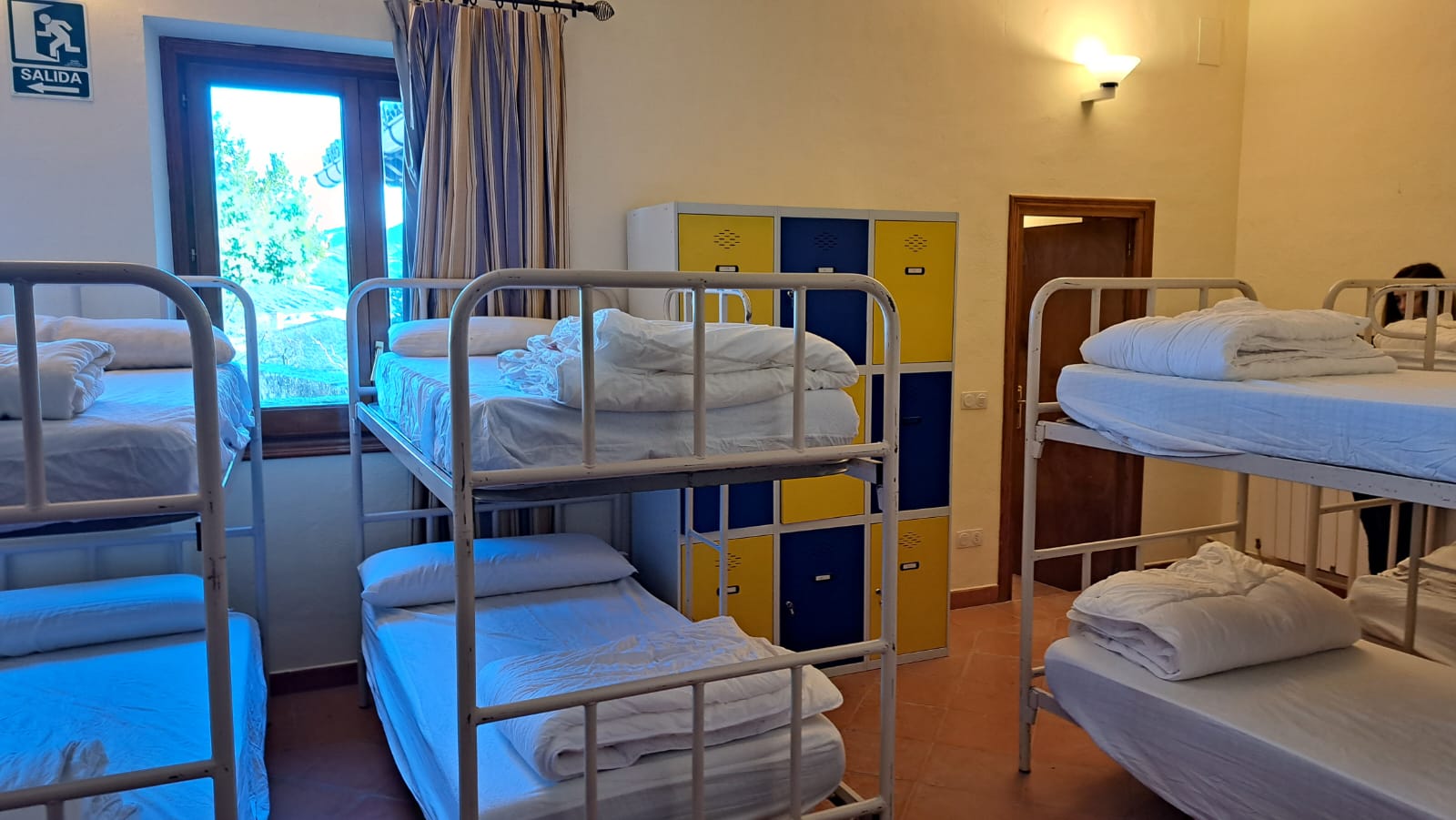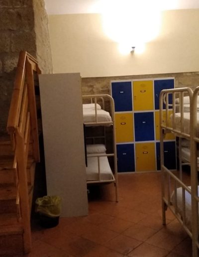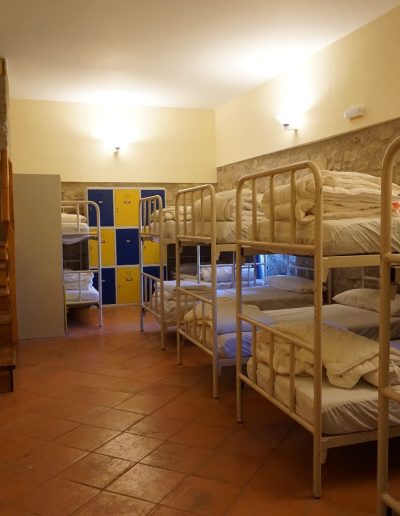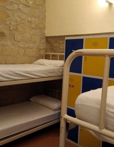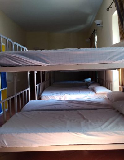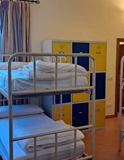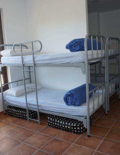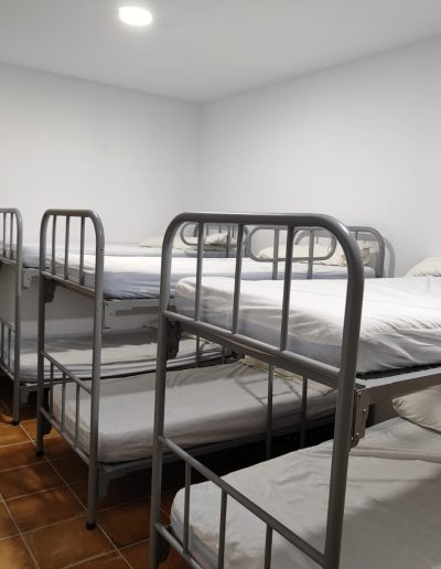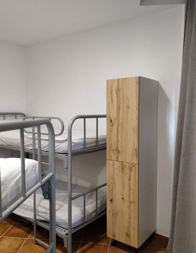 En esta habitación dispones de 8 plazas en literas y taquillas, los baños están fuera de la habitación, en un bloque de tres aseos, tres lavabos y tres duchas. Sólo se comparten con otra habitación, formando entre ambas una zona independiente de 18 plazas con baños.