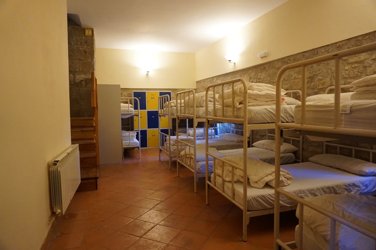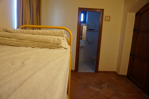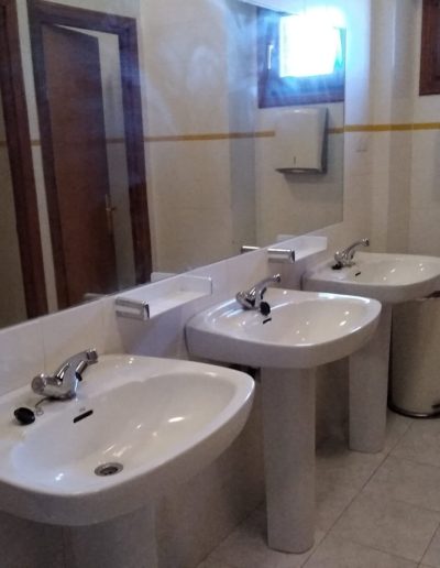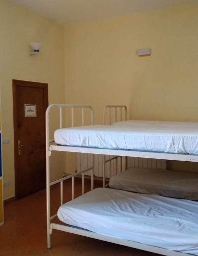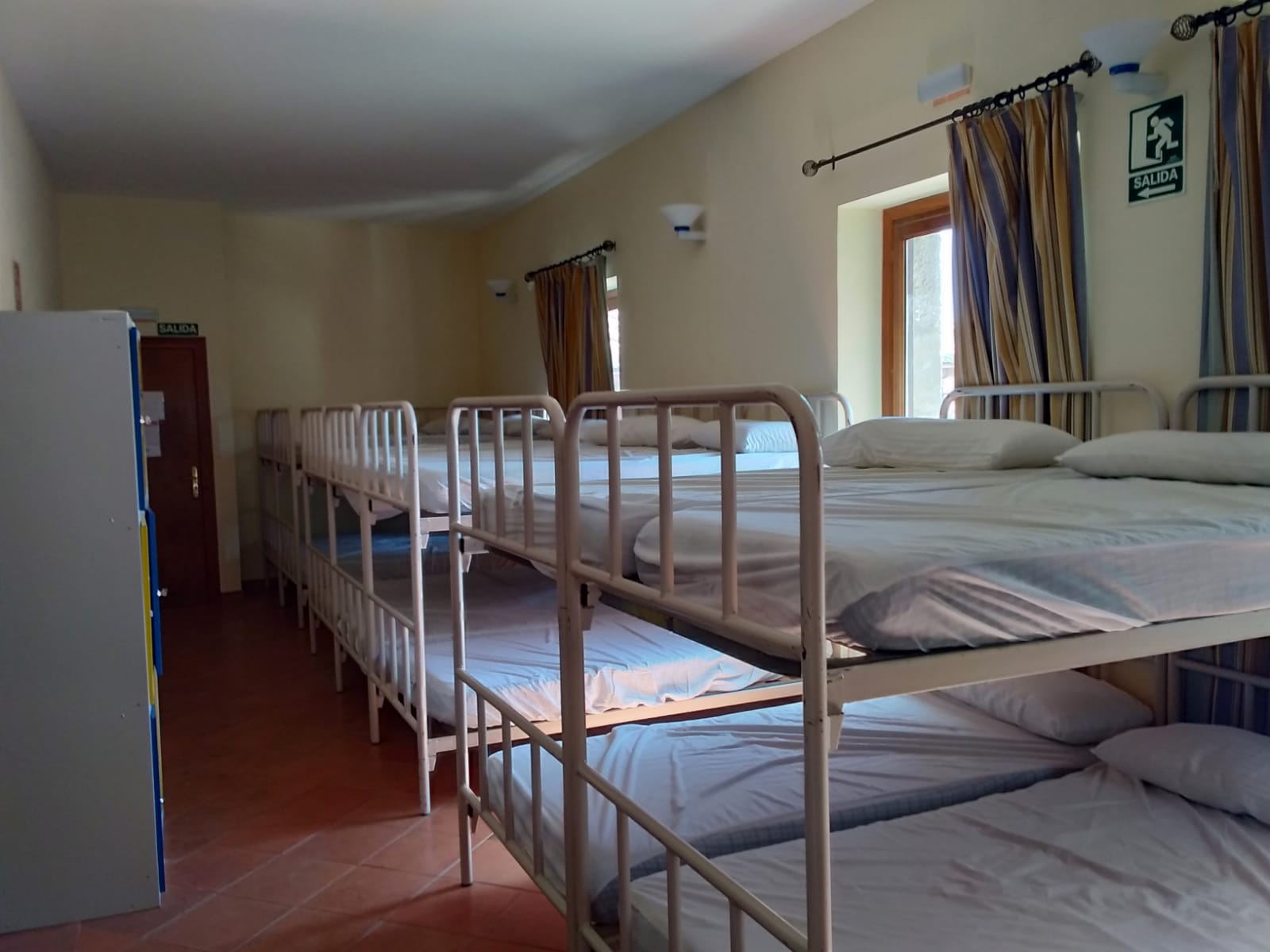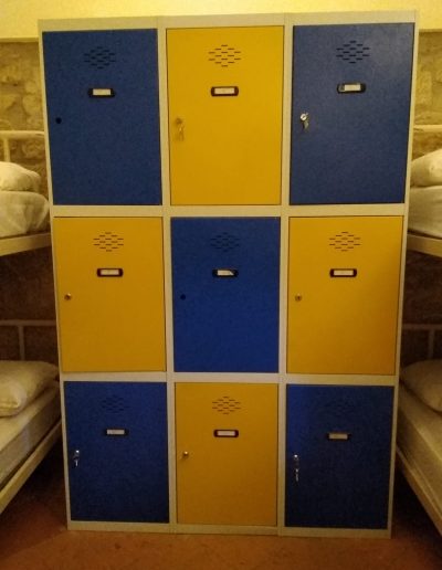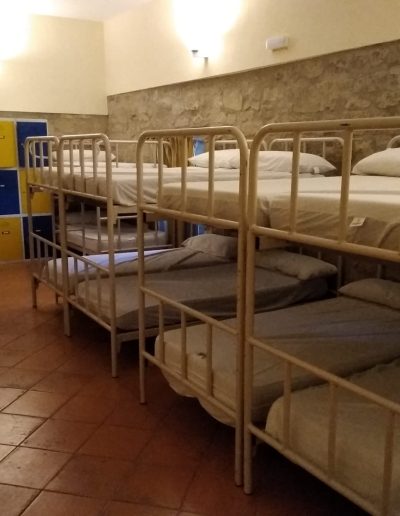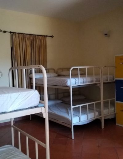 En esta habitación dispones de 8 plazas en literas y taquillas, los baños están fuera de la habitación, en un bloque de tres aseos, tres lavabos y tres duchas. Sólo se comparten con otra habitación, formando entre ambas una zona independiente de 18 plazas con baños.