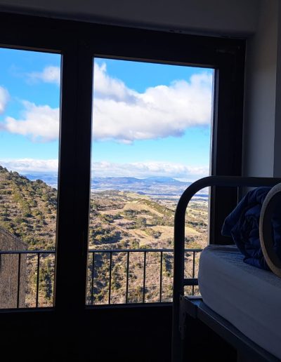 Una de las habitaciones familiares de la zona nueva del albergue. Encontramos en ella literas para 10 personas y un baño completo. Dispone de un gran ventanal con vistas, y es perfecta para venir en grupo o en familia.